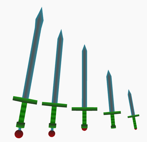 Posted: 2014-06-15 Filed under: General, WPF Leave a commentFrom left to right, Greatsword, Bastard sword, longsword, short sword and dagger. They’re all using the same coloring schemes so only the sizes and parts vary.
